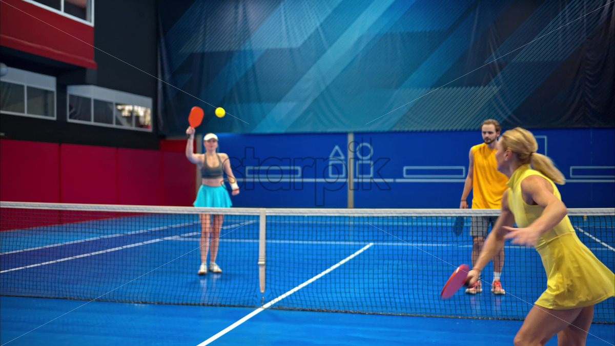 Video Two men and two women playing pickleball on a blue, inside court Royalty Free Stock Video Footage