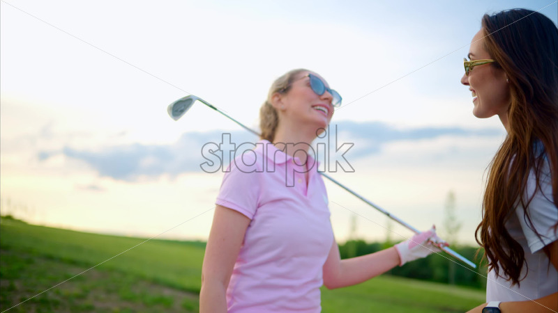 VIDEO Two women holding golf clubs talking on the course on a sunny day Royalty Free Stock Video Footage