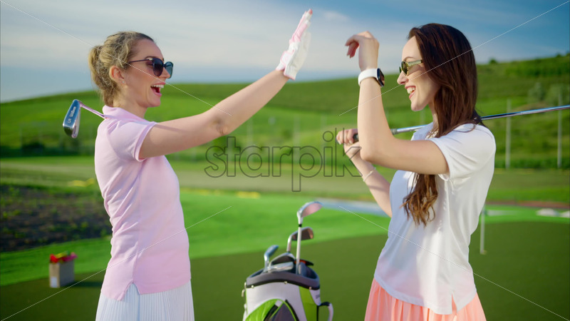 VIDEO Two woman holding golf clubs on their shoulders and high fiving each other on a sunny day Royalty Free Stock Video Footage