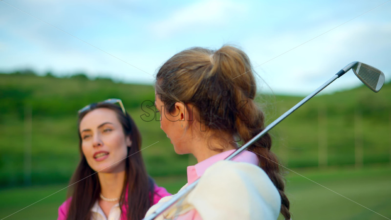 VIDEO Two women dressed in white and pink clothes, holding golf clubs and talking on the course Royalty Free Stock Video Footage