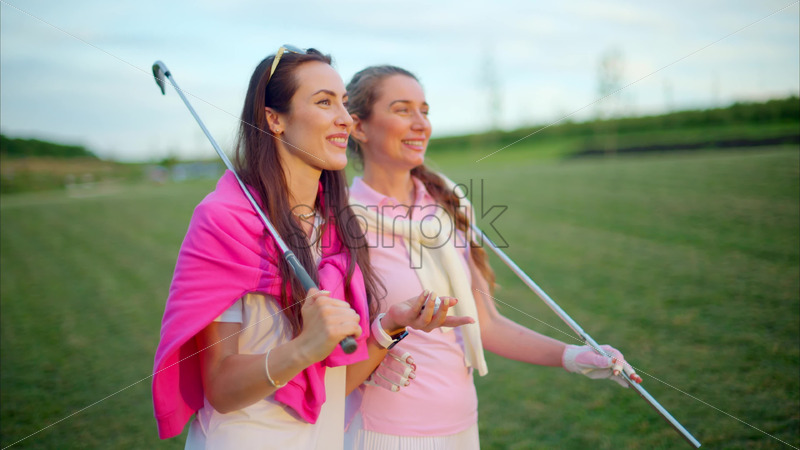 VIDEO Two women dressed in white and pink clothes, holding golf clubs and talking on the course Royalty Free Stock Video Footage