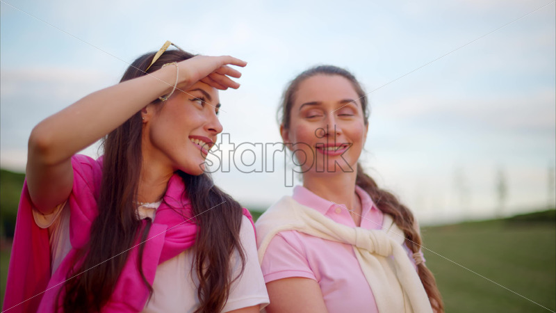 VIDEO Two women in white and pink clothes, standing and holding golf clubs, on a grass field Royalty Free Stock Video Footage