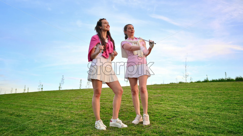 VIDEO Two women in white and pink clothes, posing with golf clubs in their hands, on a grass field Royalty Free Stock Video Footage