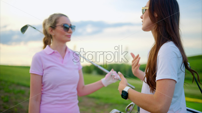 VIDEO Two women dressed in white and pink clothes, holding golf clubs and talking on the course Royalty Free Stock Video Footage