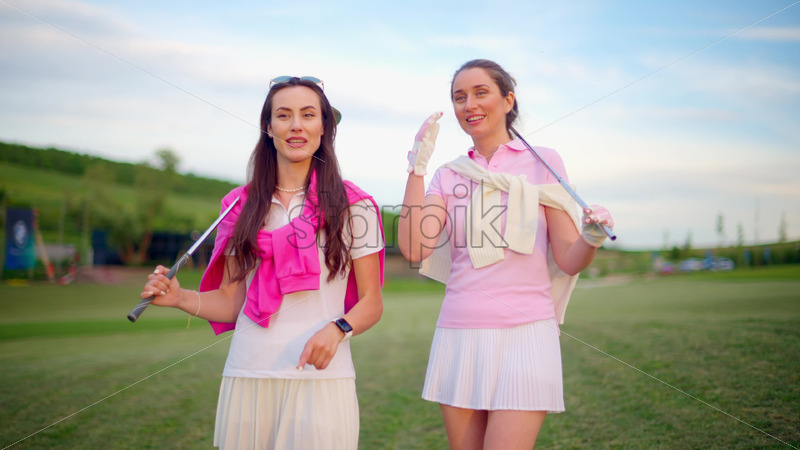 VIDEO Two women in white and pink clothes, posing with golf clubs in their hands, on a grass field Royalty Free Stock Video Footage