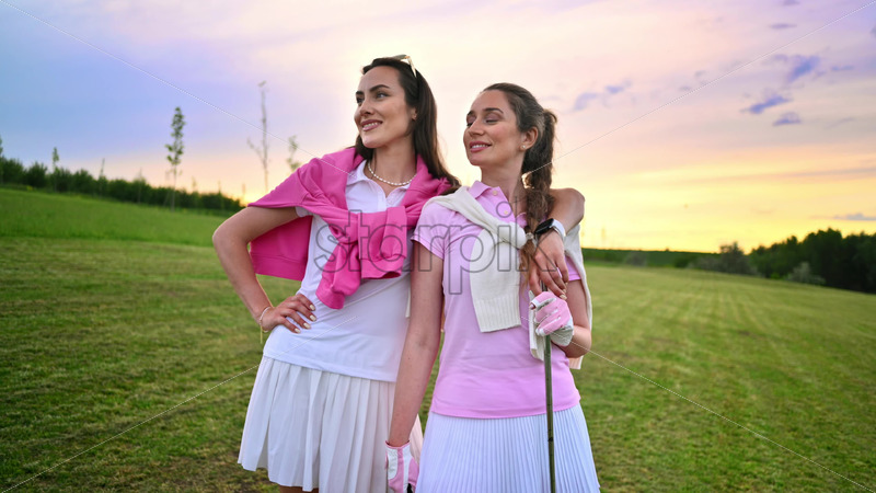 VIDEO Two women dressed in white and pink clothes talking on the golf course Royalty Free Stock Video Footage