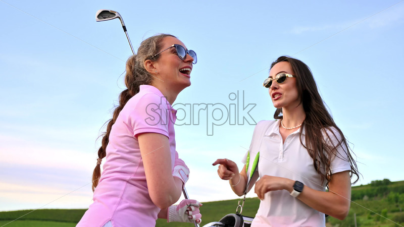 VIDEO Two women holding golf clubs talking on the course on a sunny day Royalty Free Stock Video Footage