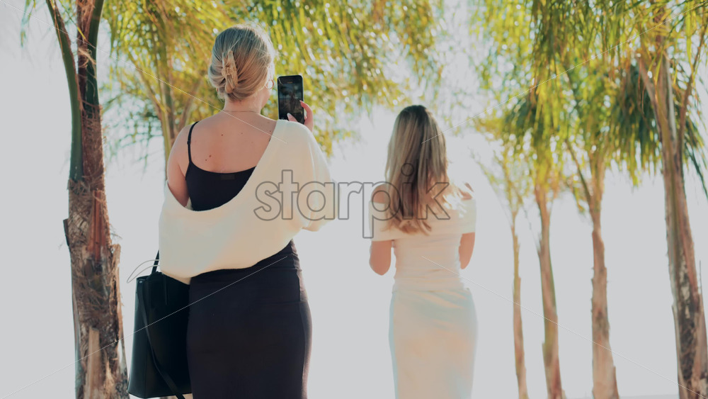 Two women in elegant summer outfits taking photos under palm trees near the beach Royalty Free Stock Video Footage