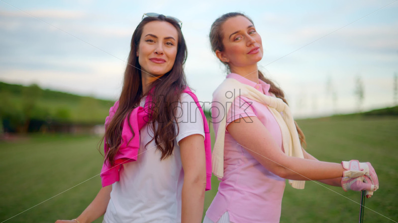 VIDEO Two women in white and pink clothes, posing with golf clubs in their hands, on a grass field Royalty Free Stock Video Footage