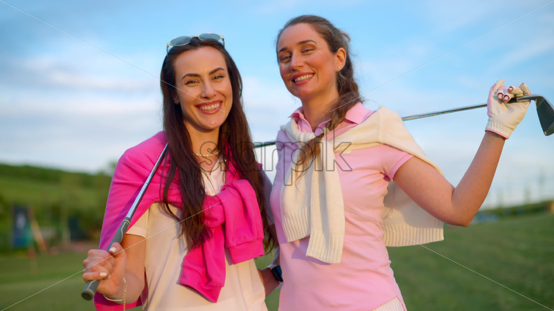 VIDEO Two women in white and pink clothes, posing with golf clubs in their hands, on a grass field Royalty Free Stock Video Footage