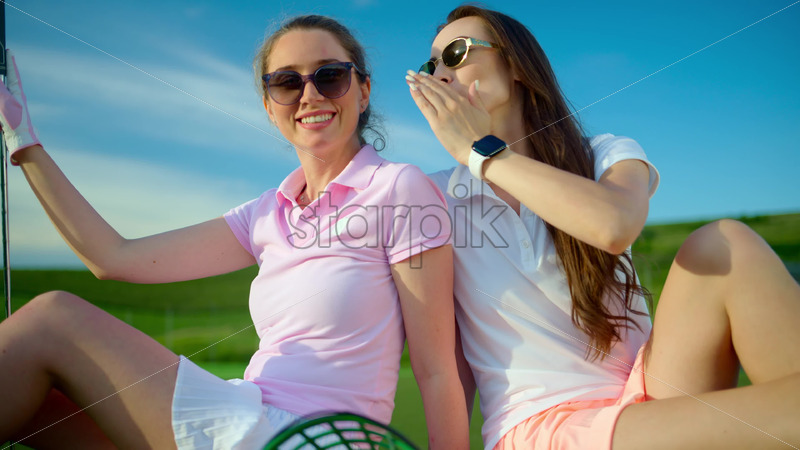 VIDEO Two women dressed in white and pink clothes, holding golf clubs, walking and talking on the golf course Royalty Free Stock Video Footage