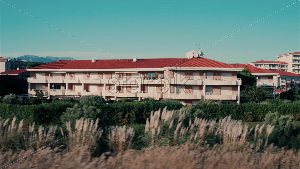video Train moving in front of buildings and palm trees on the shore with a view of the mountains in the background in Antibes, France Royalty Free Stock Video Footage