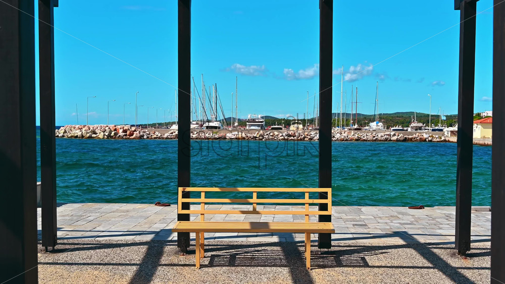 View of sea port with moored yachts, Aegean sea, view from a gazebo on a pier with black metal posts and a bench in Nikiti, Greece Royalty Free Stock Video Footage