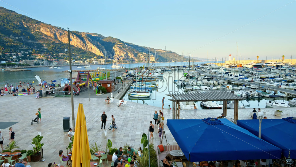 View of the Port de Menton in the French Riviera with people walking near it Royalty Free Stock Video Footage