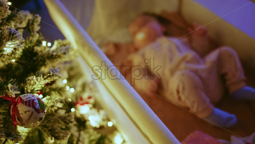 Warm and intimate Christmas scene featuring a baby lying peacefully in a cradle beside a softly illuminated Christmas tree Royalty Free Stock Video Footage