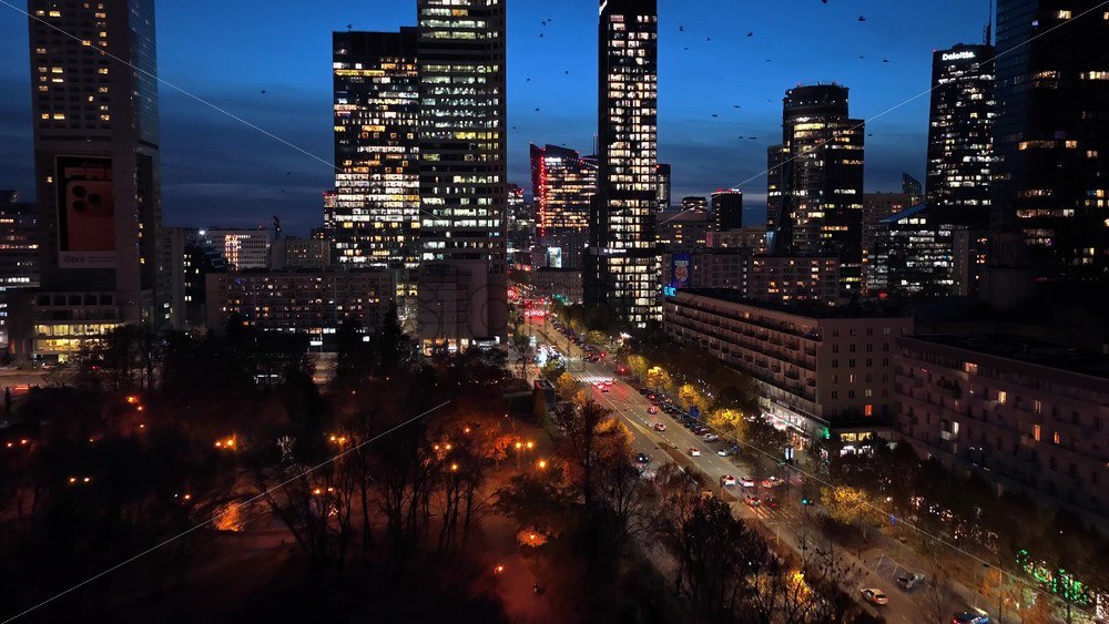 Warsaw, Poland – October 30, 2025: Aerial drone view of busy nighttime streets full of trams, buses, and headlights, surrounded by high rise offices and shopping zones Royalty Free Stock Video Footage