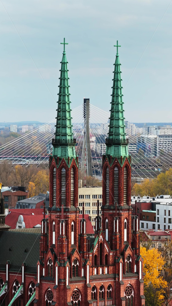 Warsaw, Poland – October 31, 2025: Aerial drone view of the facade of St. Florian Cathedral in Praga, featuring its brickwork and symmetrical Gothic design. Vertical Royalty Free Stock Video Footage