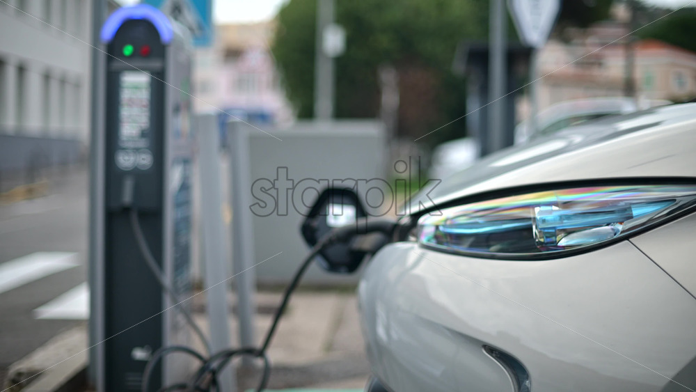 Electric car connected to a public charging station in an outdoor parking area Royalty Free Stock Video Footage