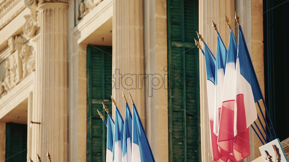 French national flags waving on the facade of a historic building in southern France Royalty Free Stock Video Footage