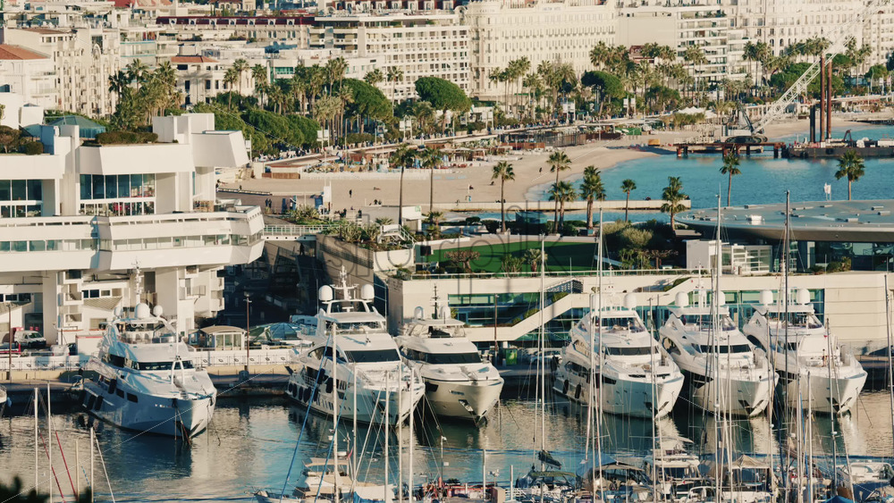 Wide shot of a luxury marina with yachts docked along a blue Mediterranean coastline Royalty Free Stock Video Footage