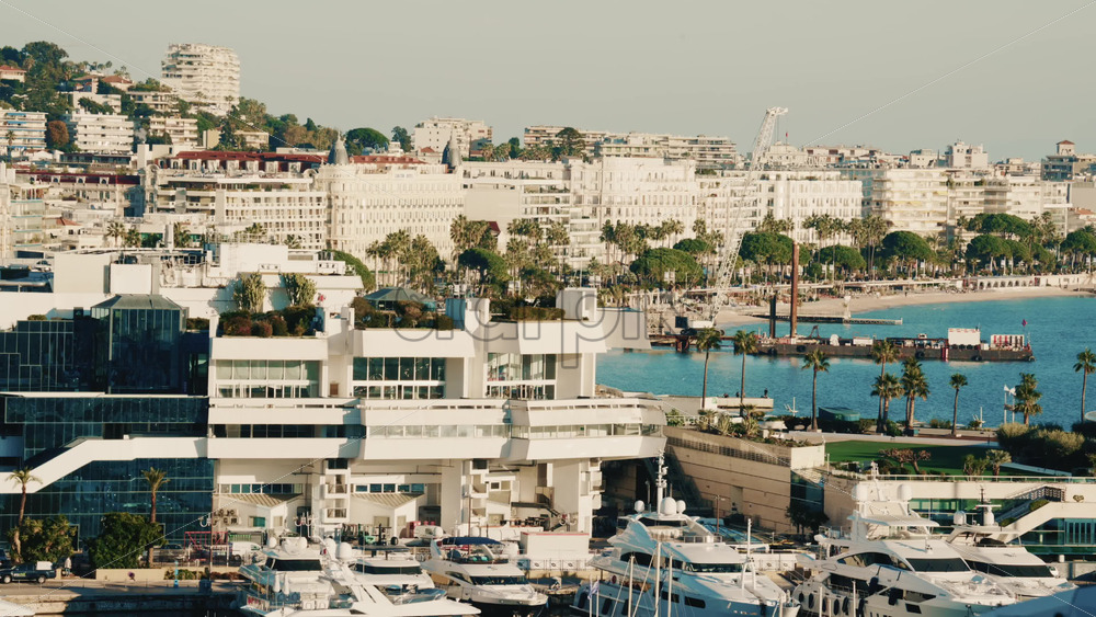 Wide shot of a luxury marina with yachts docked along a blue Mediterranean coastline Royalty Free Stock Video Footage