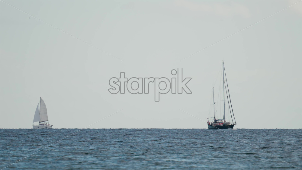 Wide shot of two sailboats navigating the calm blue sea under a pale sky Royalty Free Stock Video Footage