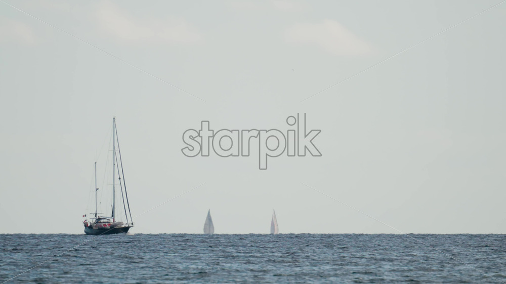 Wide shot of two sailboats navigating the calm blue sea under a pale sky Royalty Free Stock Video Footage