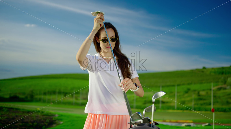 VIDEO Woman dressed in white and pink putting a golf club in a cart bag on the course Royalty Free Stock Video Footage