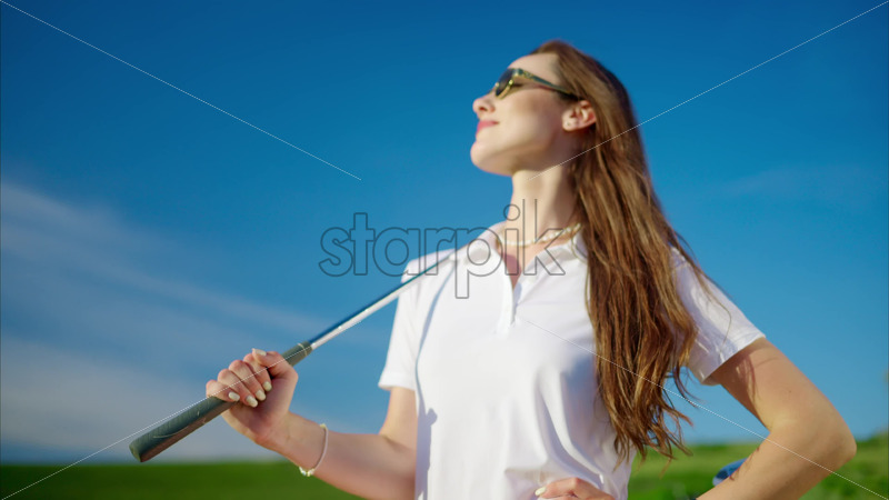 VIDEO Woman dressed in white and pink standing on a field with a golf club on her shoulder Royalty Free Stock Video Footage