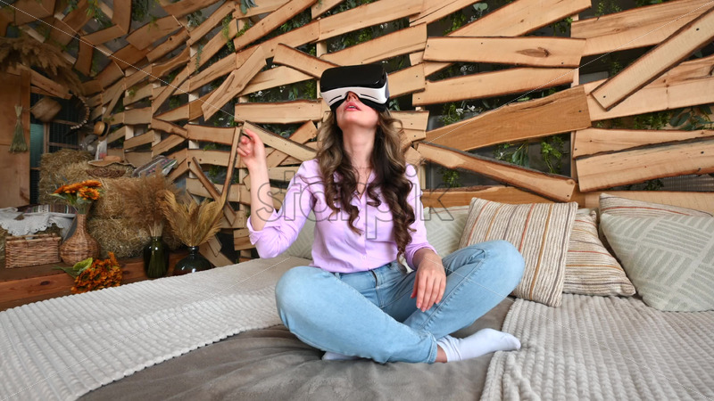 Woman looking through VR headset and jumping on bed Royalty Free Stock Video Footage Royalty Free Stock Video Footage
