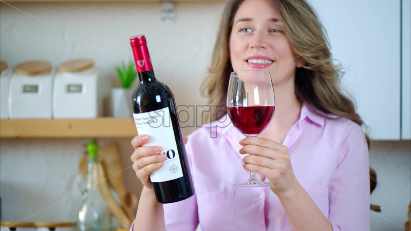 VIDEO Woman holding a bottle and drinking a glass of red wine in the kitchen Royalty Free Stock Video Footage
