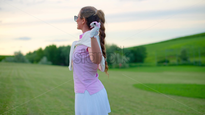 VIDEo Woman holding a golf club on her shoulders, watching the sunset Royalty Free Stock Video Footage