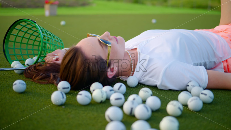 VIDEO Woman lying on the golf course near a bucket with spilled balls Royalty Free Stock Video Footage