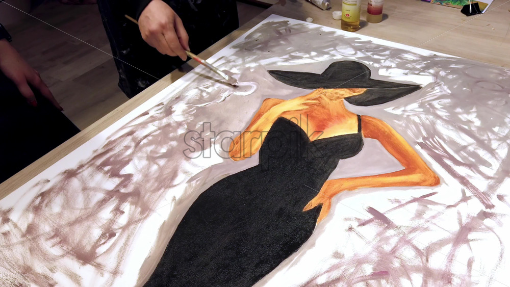 Woman painting a female body on a canvas at an art gallery workshop. Vertical Royalty Free Stock Video Footage