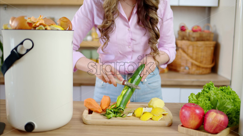 VIDEO Woman peeling vegetables and recycling organic waste in the kitchen Royalty Free Stock Video Footage