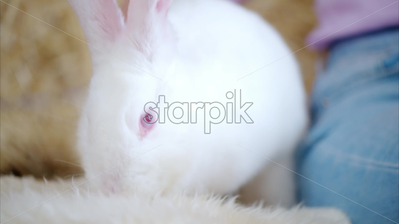 Camera filming a woman petting a white bunny in the barn near square hay bales Royalty Free Stock Video Footage Royalty Free Stock Video Footage