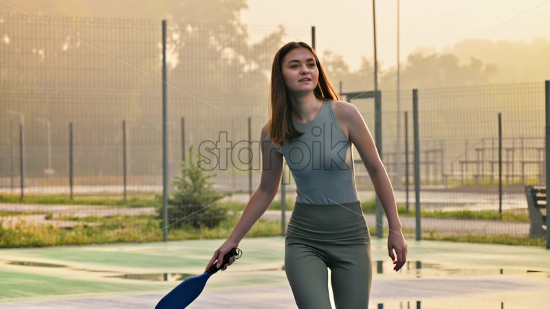VIDEO Woman playing pickleball on a blue and green court at sunrise, after rain Royalty Free Stock Video Footage