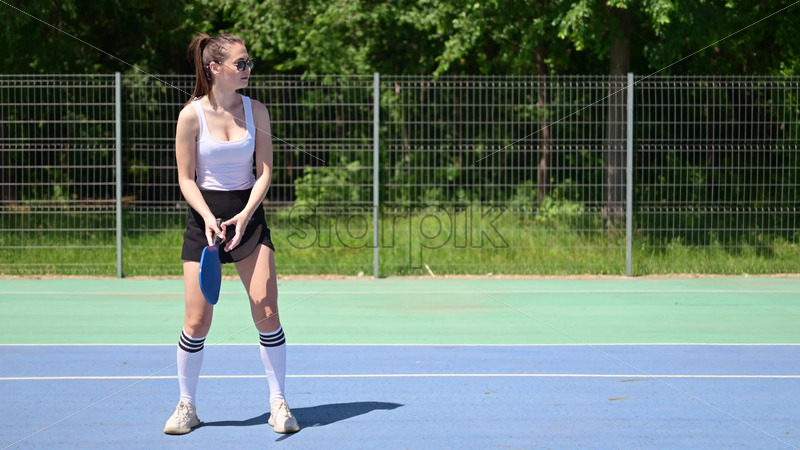 VIDEO Woman playing pickleball on a blue and green court at sunrise, after rain Royalty Free Stock Video Footage
