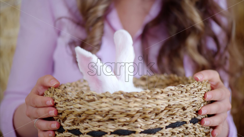 Woman petting a white bunny in the barn near square hay bales, in daylight. Vertical Royalty Free Stock Video Footage Royalty Free Stock Video Footage