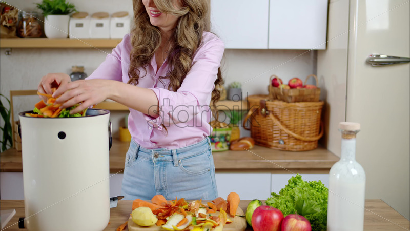 Home » Shop » 1 Video » people » Video Woman recycling organic waste by composting vegetables peels in the Bokashi in the kitchen