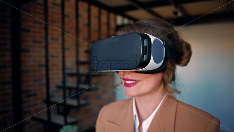 VIDEO Woman smiling while using a Virtual Reality headset in an office Royalty Free Stock Video Footage