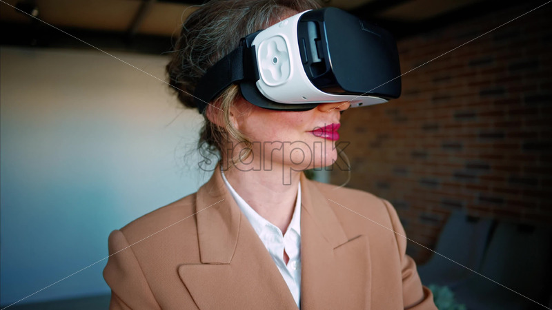VIDEO Woman gesturing while using a Virtual Reality headset in an office Royalty Free Stock Video Footage