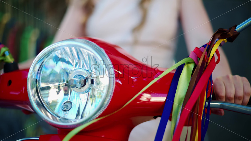VIDEO Woman standing on a red scooter with colourful decoration hanging from the mirrors Royalty Free Stock Video Footage