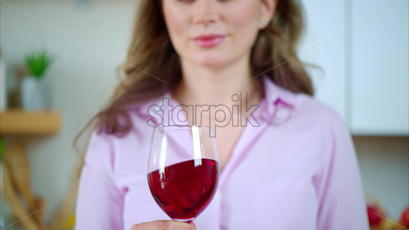 VIDEO Woman swirling a glass of red wine in the kitchen Royalty Free Stock Video Footage