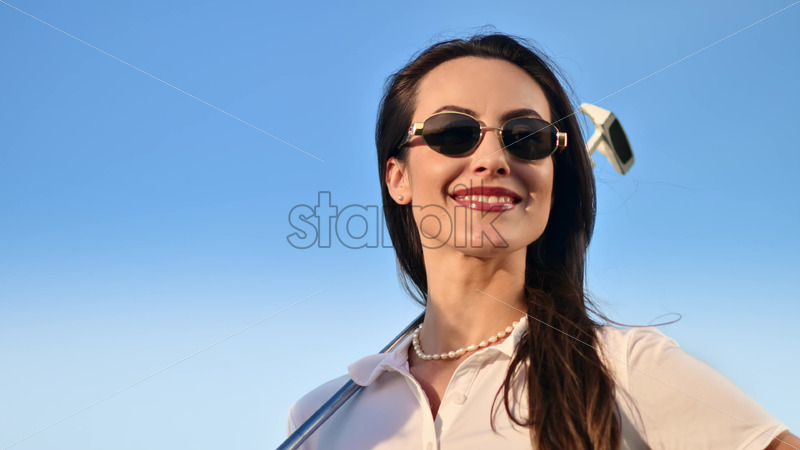 VIDEO Woman wearing sunglasses, holding a golf club on her shoulder with the blue sky on the background Royalty Free Stock Video Footage