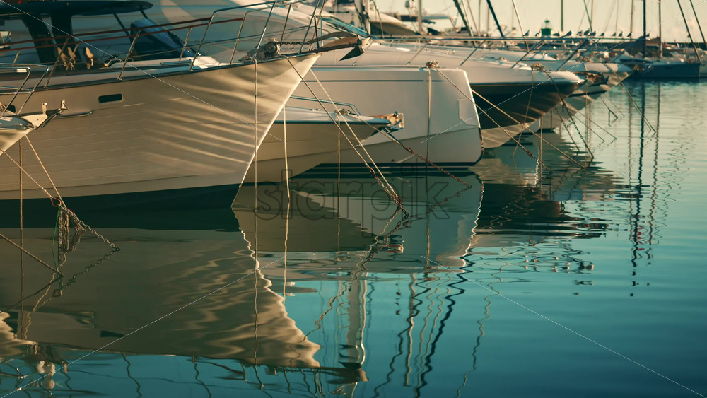 Yachts lined up at a marina with reflections on calm water during daylight Royalty Free Stock Video Footage