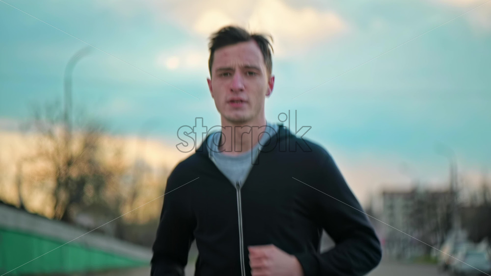 Young focused man running in jacket. Cloudy weather. Slow motion Royalty Free Stock Video Footage