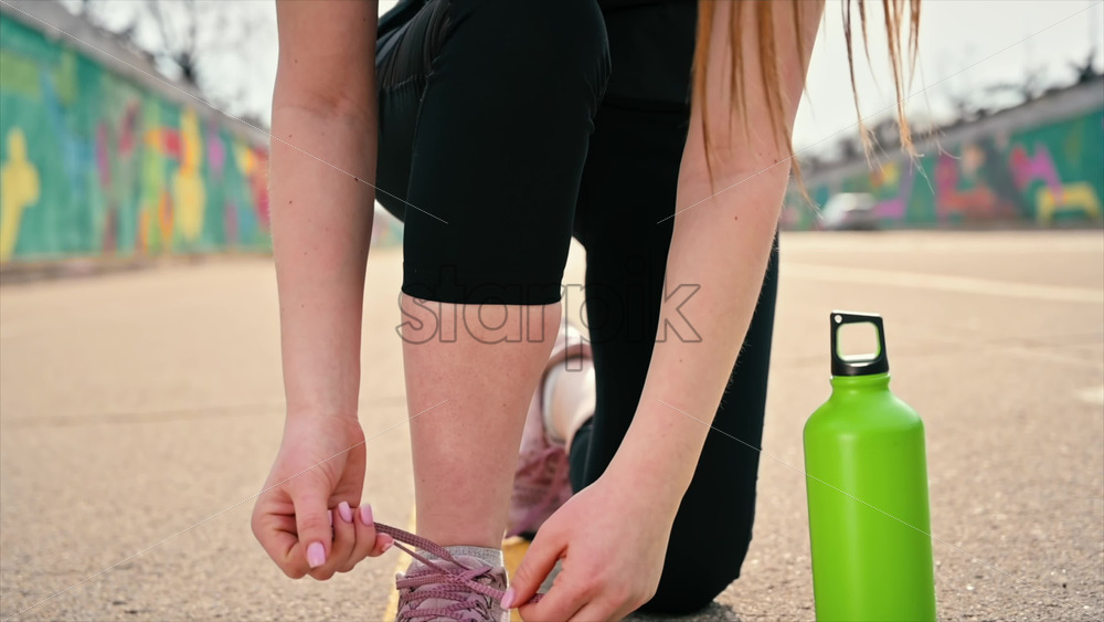 Young woman at outdoors training in sportswear is on her fitness bracelet, earphones, multicolored background. Slow motion Royalty Free Stock Video Footage