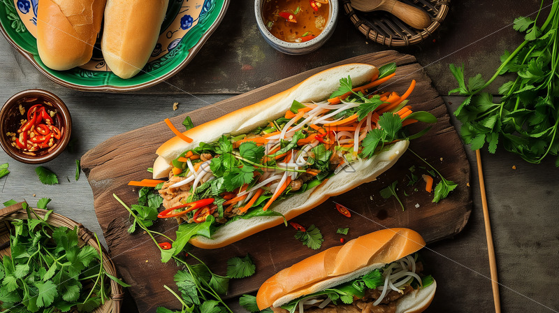 Vietnamese Bánh Mì, a flavorful sandwich with various fillings, presented on a rustic wooden board.