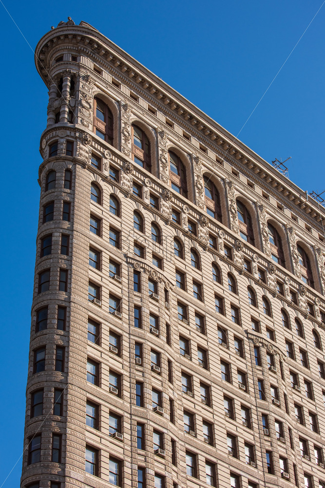 Close view of the Flatiron Building facade in New York downtown, USA